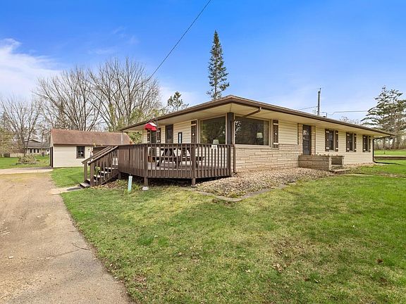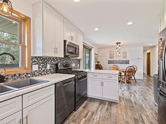 Beautiful turnkey and remodeled ranch styled home in the heart of Sandstone with all living facilities on one level. New windows (2022), primary bedroom ensuite added with double sinks and built in dresser (2022), completely remodeled kitchen with new stainless steel appliances (2018), added main level laundry room with barn door (2018), new furnace (2017), central air added (2011). This home has three large bedrooms on one level and full unfinished basement ready to finish for more added square feet. Large 2 car detached garage and space for off-street parking as well. Large private corner lot with added 7,500 square foot adjacent lot north of home. Enjoy summer nights on the large deck and patio. Homeowners have lovingly cared for this home for over 40 years!