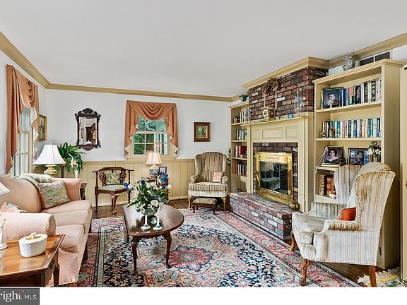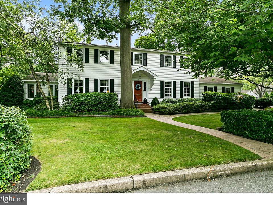 Welcome to this 5 bedroom, 2.5 bath, stately Colonial home. Situated in a park-like setting, this home is within walking distance to Moorestown's Main Street and its shops and less than a block to the town's green acres sledding hill. As you arrive at the home, you will be greeted by a paver walkway surrounded by professional landscaping and mature specimen trees. Upon entry you will find the foyer with neutral paint colors and beautiful hardwood floors which continue throughout most of the home. The living room features crown moulding, wainscoting, and a 2-sided gas fireplace with custom mantel and is surrounded by built-in shelving on each side. The formal dining room with crown moulding, wainscotting and chandelier, opens to the beautifully updated eat-in kitchen, which includes white cabinetry, stainless steel appliances, Silestone counters, and tile flooring, adjacent to a large laundry room with pantry shelving. The kitchen is open to the cozy family room which shares the 2-sided fireplace and includes French doors that open to a lovely and perfectly located sun room. The sunroom features a vaulted wood ceiling, ceiling fan, walls of windows offering views of the outdoors and an abundance of natural light, and French doors that lead to a brick patio surrounded by meticulously cared for gardens. A wood staircase leads you to the 2 nd level of the home offering hardwood flooring, custom bound carpeting, 5 bedrooms, hallway bath, master suite with spacious walk-in closet with access to attic storage, and an en-suite bath with updated vanity and tile floor. This wonderful home also includes a full size basement, 2-car garage, and a spacious yard that extends back beyond the driveway with a charming matching potting shed and irrigation system. Located close to shopping areas and restaurants, with easy access to the town center. Come and begin filling this wonderful home with your family memories.