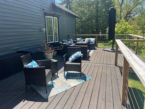 Downstairs, you'll have an incredible, custom kitchen with everything you need to cook, dine, work, and relax. Stainless steel appliances, special walnut-wood detail, kitchen television, and 360 degrees of beautiful granite and white subway tile. The outside sanctuary shines in through the big kitchen bay window. Full size pantry with basics, full accompaniment of cooking utensils, kitchen linens, pots, pans, silverware, and glassware. Place setting for four. Brand new plush white couch in the living room overlooking the peaceful pond through the large slider doors. Massive living room TV. Brand new deck accessible directly from the living room with gorgeous sunsets and wildlife viewing. Deck furnished with wraparound lounge seating and new plush cushions. Customize your deck sun and shade with the giant 10-foot swivel and tilt umbrella. Two separate roomy den spaces, each with their own TVs, couch and table, on the first floor. Half-bathroom downstairs with spacious built-in shelves.