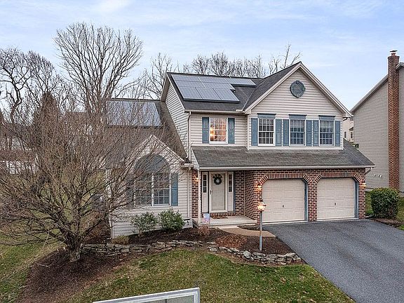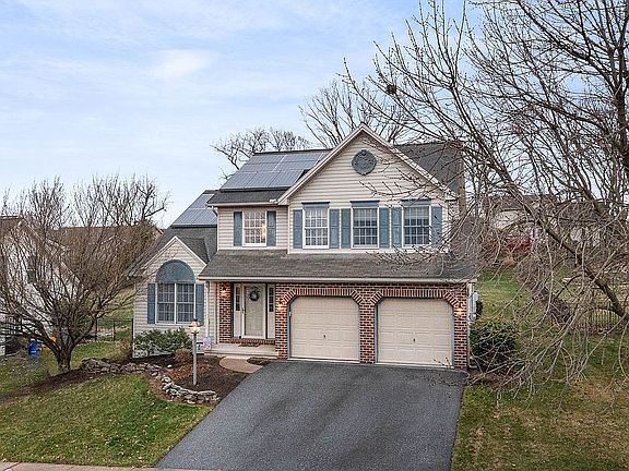 Welcome to this lovely home situated on a spacious lot in the desirable Graystone Farms community! Totaling over 1,885 square feet of living space, this home is filled with great features throughout including some fresh paint. Step inside where you will be greeted to the foyer with hardwood floors, vaulted ceilings and a large coat closet. Family room features carpet and window treatments that leads to the oversized kitchen with vinyl flooring, eat in breakfast space and pantry for storage. Main level mudroom with carpet floors and built ins. Make your way upstairs to find three generous bedrooms. Primary bedroom features carpet, ceiling fan, window treatments and a full bath with vinyl floors, double vanity and a garden tub. Unfinished basement with shelving provides for additional storage space. Head outside where you will find a spacious patio overlooking the cleared backyard with shed, a great space for outdoor enjoyment. Two car garage. Conveniently located to shopping, dining and entertainment, as well as Hershey Medical Center/Hershey attractions. Newer HVAC in 2012. Newer H2O Heater in 2017. Home features solar panels to be transferred to new owner to assist in energy cost savings. A joy to own!