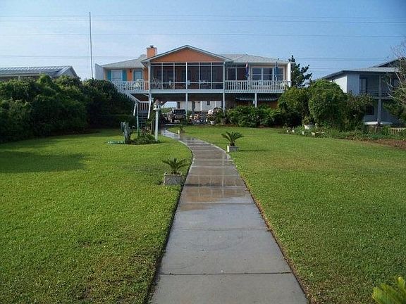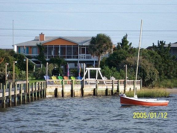 250(estimated) ft. private pier, irrigation, new roof 2009. Ground level suite has 1 BR-1BA & LR w/sleeper. Garage & Cabana Room w/kitchen & outside bar area. Upstairs has 4 BR-3BA, lg kitchen/den and screened porch overlooking sound. Appliances, 4 kayaks & most furniture stay. Only 500 ft. from ocean. Rental history is $3600 per week in peak summer months. Agent is owner. GREAT LOCATION