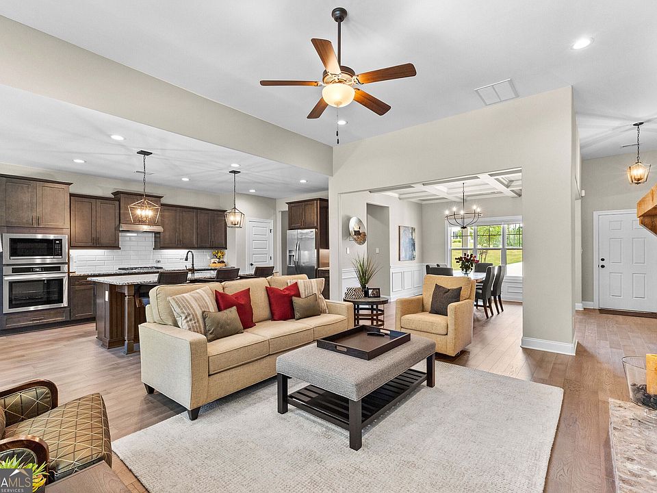 WOW - Amazing New Price - just reduced from $624,500 to $599,000 - Don't Miss It! This beautifully appointed 5 BEDROOM, 3.5 BATH home with an OVERSIZED 3 CAR GARAGE offers a FANTASTIC FLOOR PLAN. The MAIN LEVEL includes a wonderful entry foyer, that leads to open concept living - dining room with coffered ceiling and wainscoting, great room with brick surround gas log fireplace, kitchen with breakfast room that is outfitted with gorgeous granite counter tops and cabinetry, magnificently sized island, subway tile backsplash, appliances that include wall oven, microwave, dishwasher and gas cooktop, two secondary bedrooms with a shared bath that offers two separate vanity areas, the laundry room, powder room and completing the main level is the PRIMARY SUITE whose en suite offers nice sized soaking tub, gorgeous tile shower, spacious double vanity, water closet and large walk in closet. The UPPER LEVEL includes two nice sized additional bedrooms as well as the third full bath with double vanity dressing area. The outside of the home offers a covered patio w/vaulted ceiling as well as an extended deck area overlooking the rear yard and perfect for enjoying your morning coffee, outdoor dining, entertaining, reading or just relaxing at the end of the day. Additional details of this LIKE NEW home include concrete siding, marvelous lighting w/fixtures and numerous can lights, magnificent closet space throughout the home, main living areas offer hardwood flooring, tile floors in baths and laundry, carpeted bedrooms and the space the garage has offers ample space for parking and all your storage needs as well as so much more. Conveniently located to shopping, dining, recreation as well as quick and easy commuting to the airport and beyond. Schedule your showing for your new home today.