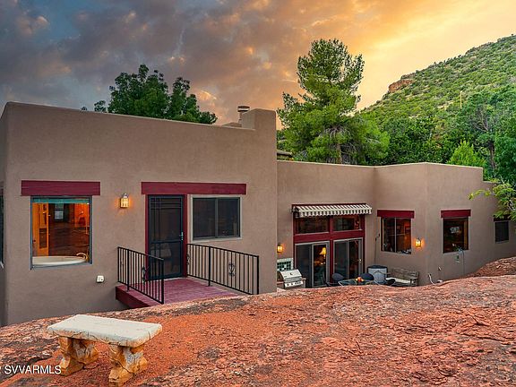 LOCATION! Golf & hiking nearbye. Custom 2324 SF home w/owner ensuite, junior suite w/BA, additional 1BR ensuite w/separate side entrance, fenced side yard, including garage access. Use as Bonus Room, Office, rental. Couldn't have a closer view of the Red Rocks. The focal point extends beyond its setting with beautiful courtyard to the full Red Rock formation with flagstone path and steps to 360 degree overlook. Your backyard is literally adjacent to this rare natural formation. The home interior floor plan is high ceiling, open and invites guests to view the outdoors from within the home. Spacious owner suite w/walk in closet, windows. Junior suite presently used as an office off of the Great Room area. Upgraded granite counters, appliances, built-ins, breakfast bar. Mtn. home feel.
