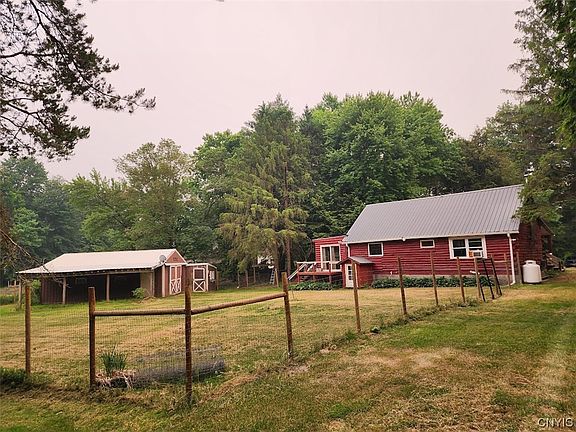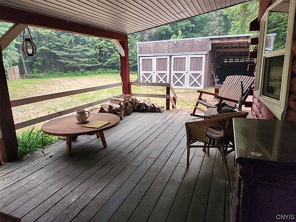 Log Cabin Hobby farm on 8.4 acres of secluded mostly wooded land! This property is ready for the outdoor enthusiasts with its 30x40 horse barn with stalls, some fencing, chicken coop, lean-to, hydrant pump for water, power and heated livestock buckets, 12x12 maple syrup and smoke house and 38x24 storage/wood shed with power! This secluded setting has plenty of space for your animals and plenty of woods and loggable timber for your outdoor fun and to fill your woodstove! Close to snowmobile and four wheel trails with plenty of parking and storage and great location for hunting. Also just a few miles from Oneida Lake boat launch for fishing! This log home was built to last with its huge cathedral ceiling great room, full basement and spacious kitchen with plenty of counter space and commercial wolf stove, this is ready for the cook of the family! Come enjoy the peace and wildlife on the large front porch!