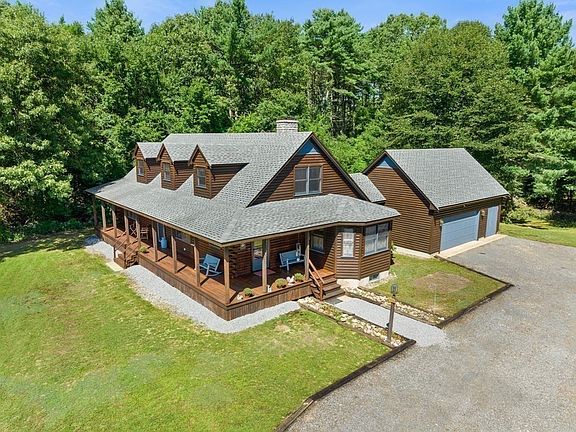 Custom-Built  authentic AmerLink cedar construction Log Cabin nestled onto 3.29 acre wooded lot.  This 3,143 s.f. home offers 2+ car garage with plenty of off street parking to accommodate, RV's, boats, etc.  First level of home has open floor plan.  The large front to back living room has vaulted ceiling with stone fireplace which is the heart of the home.  The main level includes an updated kitchen with stainless appliances & quartz countertops, extra large dining room, half bath with laundry room and large Master bedroom with full bath including whirlpool tub and separate shower.  2nd floor has two bedrooms with their own half bath, and a common shower.  Plenty of closet space & eves storage with loft overlooking fireplace below.  This spacious yet cozy real log  home has large wrap-around porch, just the perfect place to sit on your favorite rocking chair. Come by and take a look at this one-of-a-kind log cabin.  Acushnet is a "Right to Farm" community.