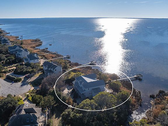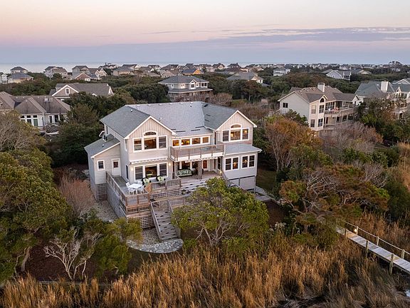 Enjoy coastal living at its finest with unobstructed water views over the Currituck Sound in this well appointed and ultra private Sanderling home. This stunning custom home built by Ken Green checks all the 'waterfront dream home' boxes situated on over 1/2 acre at the end of a quiet cul-de-sac with a private pier, kayak launch and endless sunsets on the expansive sun and covered decks. As you walk into the foyer you are greeted by a wall of windows capturing endless water views from every angle. The main level boasts a gourmet kitchen with a large breakfast bar, Hi-Macs solid surface countertops, dual sinks, built-in cooktop and double ovens, and a dining area and great room offering plenty of space to entertain all while overlooking the gorgeous sound vistas. You will also find a large private office, the perfect space to work from home and also permitted to be a 6th Bedroom, a powder room, laundry room, sunset viewing sunroom (with separate mini split), and a 1st floor King primary bedroom with more sound views. Upstairs boasts 4 additional bedroom suites with stunning picture windows and water views, all with private en suite baths, a loft style den/sitting area, a 2nd stacked full size washer/dryer, and a sun deck to take in even more sound views. Built with timeless details and amenities including an Elevator, Central Vac, surround sound speaker system, solid interior doors, hardwood flooring, gas fireplace, Juniper tongue and groove walls throughout (even more stunning in person!), and cedar lined closets, this home is both comfortable and grande and makes the perfect place to call your Outer Banks home. The ground level offers tons of storage options inside and outside, as well as covered carport space for 3 vehicles. Outside you will enjoy ample side and backyard space for outdoor entertaining, beautiful landscaping with irrigation including fig trees by the front entrance, a garden area and an outside shower. The private pier has brand new light and rope and is ideal for kayaking, crabbing, fishing, swimming and sunset watching! The Sanderling community in Duck offers a Soundfront community pool, racquet / health club and tennis courts, and boasts about a mile of uncrowded beaches, and serene nature paths. All just a short distance north of the quaint town of Duck known for its incredible shopping, waterfront boardwalk and restaurants!