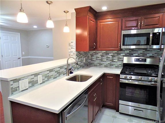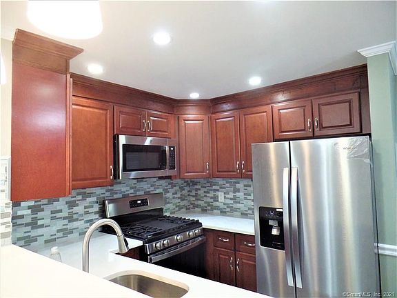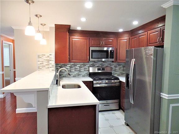 Move right into this completely up-dated first floor unit. The kitchen consists of all new Stainless Steel appliances, Corian counter tops, Mosaic tile back splash, tile flooring, breakfast bar and dining area. Spacious living room with Bamboo flooring, ceiling fan and recessed lighting. Two generously sized bedrooms with Bamboo flooring and ceiling fans. Bathroom with tile flooring and shower walls. In addition the unit has crown molding thru-out and newer vinyl windows. Commuters delight with easy access to Merritt Parkway, Route 8/25 and I95. Walking distance to Beardsley Park.