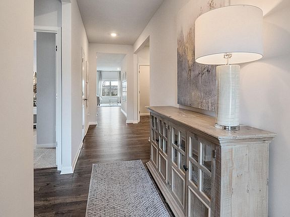 The appealing one-story home includes many contemporary features, and an open-concept design and 9' ceilings enhance the wonderful feel of this home. The kitchen includes a large island perfect for bar-style eating or entertaining, a walk-in pantry, and plenty of cabinets and counter space. The dining room and living room both overlook the covered porch, which is a great area for relaxing and dining al fresco. The large Bedroom One, located at the back of the home for privacy, can comfortably fit a king size bed, and includes an en suite bathroom with double vanity, big walk-in closet, and separate linen closet. Three other bedrooms share a second bathroom. The two-car garage connects to the front hallway where the laundry room and an extra storage closet are also located. Pictures, photographs, colors, features, and sizes are for illustration purposes only and will vary from the homes as built.