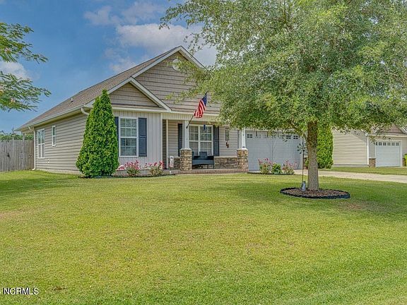 Welcome to country living just minutes from town! Heritage Farms in Havelock is just minutes away from Cherry Point, shopping, and boating! The country atmosphere of 110 Gristmill Drive is seated on a groomed cul-de-sac street with a large lots, fenced yards and covered front and rear porches! No city taxes. Freshly painted living space, laminate flooring in the foyer, dining room, living room, and all bedrooms and vinyl in the kitchen and bathrooms. The main bedroom has a tray ceiling, private bath, and a large walk-in-closet. The stone veneer and cedar shake accents on the front of home add a touch of distinction. The kitchen has a new dishwasher and refrigerator, and glass tile backsplash. The open concept allows the perfect flow from kitchen, to dining, to living area for entertaining and family activities. Vaulted ceiling adds depth to accent wall and fireplace. HVAC was replaced in 2023. Spacious two car garage and the rear yard features a 6ft wooden privacy fence, covered rear porch and shed.