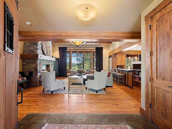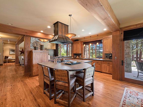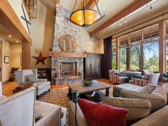 Welcome Home. Your Mountain retreat awaits, a Kurt Reinkens design located with the prestigious Lahontan community. Upon entering the home you are greeted with a living room perfectly designed for sitting by the fire, watching a movie or enjoying a game of chess as you watch the snow fall. The kitchen boasts a prep sink as well as a large farm sink, 2 dishwashers and is completed with granite countertops. The kitchen also includes 2 eat in bars and leads directly to the dining room, that looks out over the porch swing and the 180 degree view of the corner lot. The Primary Suite, located on the first floor, includes access to the back patio, a fireplace, and a large walk in closet. The Primary Bathroom consists of a walk in shower with custom tile work, 2 vanity sinks and a large soaking tub. The stairs are adorned with custom wrought ironwork. Upstairs is the Jr Suite with views overlooking the Meadow and an ensuite bathroom. The game room provides the perfect area for a friendly game of scrabble or a cozy spot to curl up with a book. The 2 secondary bedrooms include ensuite bathrooms perfect for a multi generation family gathering. The Interior of the home is finished off with a large drop zone area included in the laundry room. The ski room/mud room directly off the oversized 2 car garage provides a perfect spot to hang up snow filled clothes and a large bench to sit while you remove your snow boots. Outside is a back patio perfect for ending the day watching the sun set or roasting up s’mores at the fire pit.