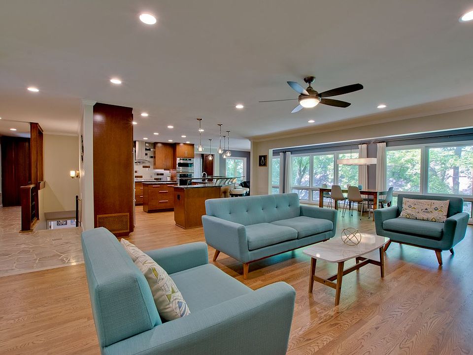 - LIVING ROOM DESC: Crown Mold, Smooth Ceiling, Wood Floor, Ceiling Fan, Recessed Lighting