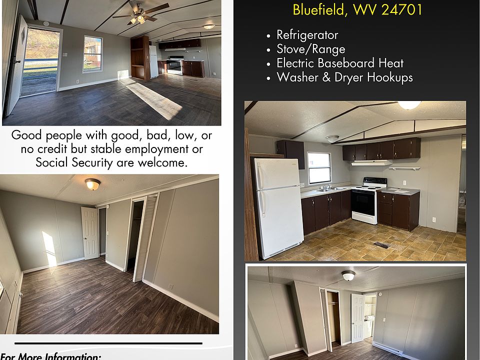 110 Joyner Lane ~3 Beds 1 Bath~ Bluefield, WV 24701 LEASE OPTION (Path to Home Ownership): Initial payment: $1,500 with no payments due until the 1st of the following month! Monthly payment: $695/month includes lot rent. No utilities included. or RENTAL: Security Deposit: $695. Can be made in payments if needed. Monthly payment: $695/month includes lot rent. No utilities included. Sorry, this home is not HUD approved. 3 bedroom, 1 bathroom single wide mobile home available for rent or path to home ownership located close to Mercer Mall with a country setting. Open floor plan. Furnished with stove and refrigerator. Laundry room with washer & dryer hook up and storage. New efficiency electric baseboard heat throughout. Fresh paint throughout and vinyl flooring for easy cleanup. Large front and back deck for entertaining with large flat yard. This home has a partial fenced in back yard with beautiful views of the mountains. Private with having only one neighbor. Plenty of parking with private gravel driveway. Lot rent included. Move in today! Christian Management Corporation Office Hours: Mon-Fri 9:00AM-5:00PM & 10:00AM-2:00PM the 1st Saturday of every month You can view THIS property 7 days a week! Most pets welcome with a $300.00 pet fee per pet and signed pet agreement. Maximum 2 pets. No aggressive breeds due to insurance restrictions. Clean, safe, quiet, crime & drug-free are our priorities for our residents! We support Equal-Housing Opportunities! Good people with good, bad, low, or no credit but stable employment or Social Security are welcome. -MUST pass background check -NO evictions in the last 7 years -NO sex offenders Is this property not what you are looking for? View our other available #homes, #mobilehomes, #apartments, and more on our Facebook or our website!