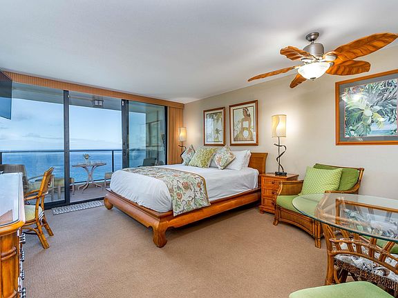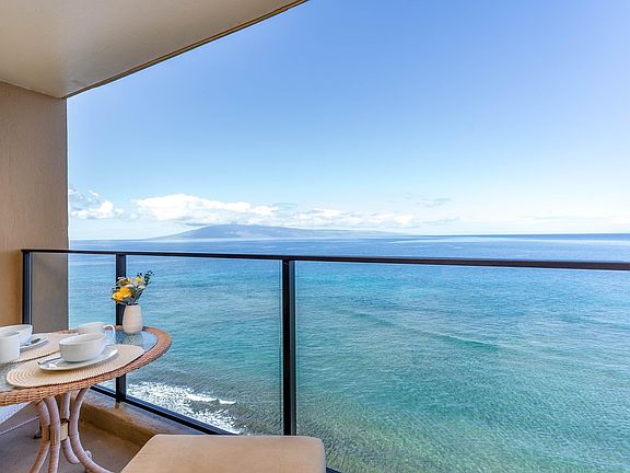 Penthouse studio at the Mahana at Kaanapali! Unobstructed panoramic ocean views, year-round sunsets and views of the neighbor islands of Lana'i and Moloka'i. Picture perfect spot to watch the humpback whales breaching in winter, dolphins and the turtles playing in the surf below. Tastefully decorated and finished with granite counter tops, hardwood cabinetry in the kitchen and bath, travertine shower, custom lighting and stainless-steel appliances. Mahana offers a quiet beachfront location at the northern end of Kaanapali Beach under the shade of the giant Monkeypod Trees. Amenities include a beachfront swimming pool, hot tub, grilling facilities, shuffleboard, and tennis court; adjacent to the 3-mile beachfront boardwalk that connects several Kaanapali resorts, restaurants and ocean activities. Unit is in a self-managed vacation rental program and future bookings can be transferred to the buyer. AAAO monthly dues: $722.19 maintenance + 336.18 utilities + 397.05 reserve = $1,455.42. Additionally, there is a special assessment of $981.08 per month with a remaining balance of $36,000. Seller will pay this balance prior to close of escrow. Buyer hereby acknowledges that it is the intent of Seller to effect an IRC §1031 tax deferred exchange, which will not delay the closing or cause additional expense to Buyer. Seller’s rights under this agreement may be assigned to a Qualified Intermediary, for the purpose of completing such an exchange. Buyer agrees to cooperate with Seller and Qualified Intermediary in a manner necessary to complete the exchange. Check out the outstanding reviews of Mahana 1202 on VRBO.