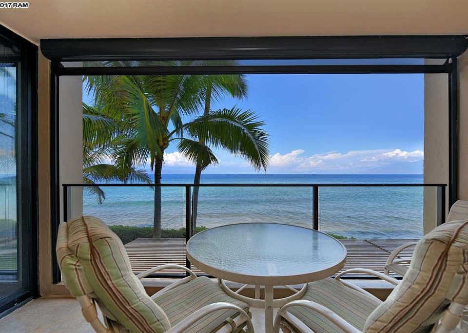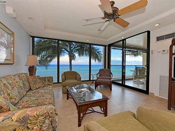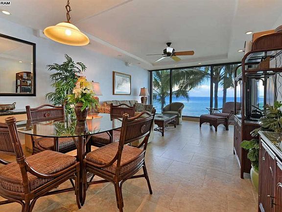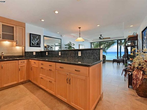 Direct oceanfront one bedroom unit at the exclusive Mahana property. Floor to ceiling windows offer stunning views of the ocean and island of Molokai. The spacious lanai offers a private retreat to relax and watch the turtles, dolphins and of course you have front row seats for the Whales in season. Unit 208 is rated in the premium category in the onsite Aston vacation rental program. It has been beautifully upgraded with tile floors throughout the entry, living room and bathroom areas. The kitchen has all wood cabinets, recessed lighting, granite counter tops and a modern glass tile back splash, with colors of the ocean to compliment the stunning views. There is also a built in desk area with extra cabinets in the dining area. The bathroom is fully tiled with a walk in shower and glass enclosure and separate vanity area. Lot's of great storage in the unit as well as an exterior storage just across the hallway from the front entrance. Being sold furnished with some exclusions on artwork. This second floor location at the North end of the Molokai wing offers close access to the stairwell so its easy to get to the grass area and to the parking area without having to walk to to elevator. The Mahana is peaceful and quiet with an island ambiance away from the crowds yet it's close enough to several shops and restaurants. Amenities include a spacious beachfront swimming pool, sauna, shuffle board, BBQ grilling facilities and tennis court. Monthly fee consists of Utilities $353.53 Maintenance $844.21 and Reserve fees $518.07 for a total of $1,715.81. Check out the 3D tour and dollhouse floor plan for a virtual walk through.
