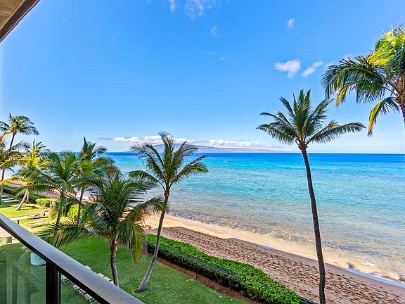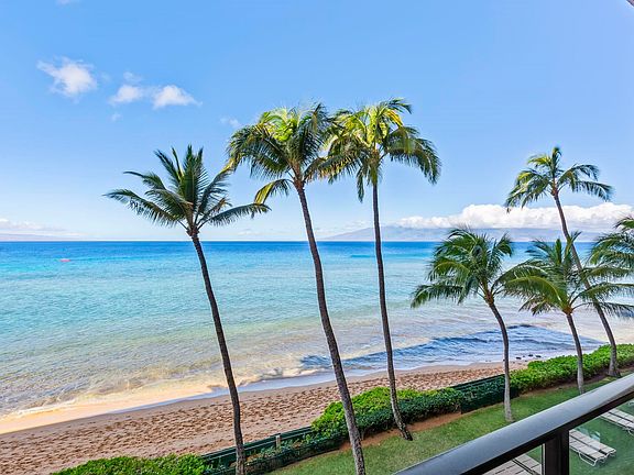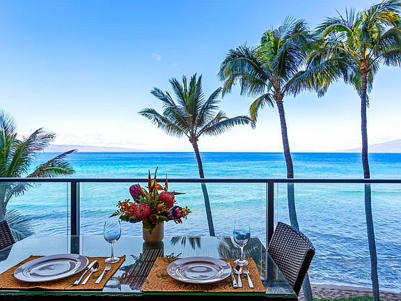 This beautiful TURNKEY VACATION RENTAL oceanfront condo on North Kaanapali beach sleeps 2-4 and features a convenient second bathroom. Enjoy stunning views of the ocean, beach and outer islands from the living room, dining area, bedroom, and lanai. Living room highlights include tile floors, 65" Smart HD TV (access your Netflix and Hulu accounts), blu-ray DVD player, and large sectional with queen sofa bed. The bedroom boasts a 65" HD TV, DVD player, ceiling fan, and plush CA king mattress. The kitchen has granite countertops with stainless steel appliances and both bathrooms include granite counters with large walk-in showers. This unit also includes a workspace with free Wi-Fi. Additional extras include central air-conditioning, washer dryer, free long distance to US and Canada, as well as no resort fees or parking fees. What's Nearby: - Located in the convenient Honokowai area - within walking distance to groceries, beach restaurants, take-out, snorkeling, and dive shop. - A private gate from the Mahana provides easy access to the Kaanapali Boardwalk that extends for miles and leads to the Kaanapali Beach resort area. The boardwalk is perfect for jogging or walking and Duke's restaurant is convenienly located next door. STRONG RENTAL HISTORY