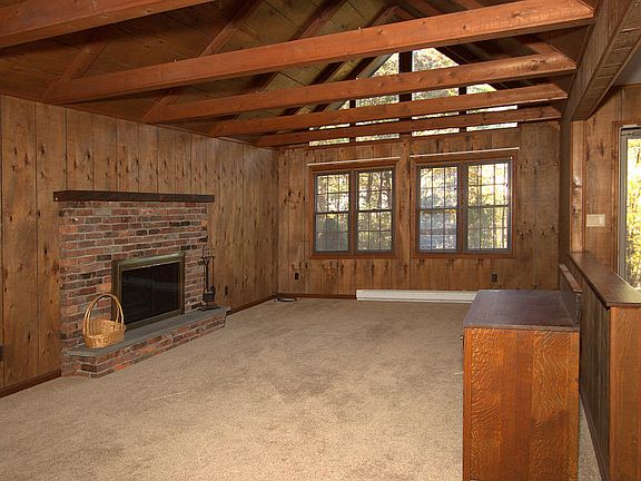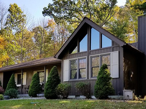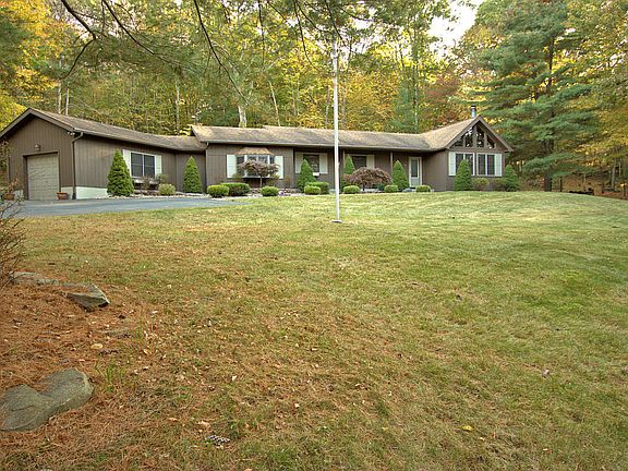 Beautiful setting! Close to town & Lake Wallenpaupack, yet privately tucked away in the woods. Lovely rustic ranch is surrounded by beautiful stone walls & a large sloping front yard. A dramatic cathedral ceiling with chalet style windows at each end give the living & dining area an authentic cabin feel. Along with the master bed w/full bath, there are 2 more bedrooms, a full bath, & a large family room w/fireplace. Breezeway has been outfitted w/a Murphy bed & storage as a fun way to accommodate house guests. (Could be a great office, too!) Use the garage as a garage or open the door wide for a summer party; it even has a fireplace & pretty flooring! There is a back patio, storage shed, and plenty of space between you & your neighbors. Parking pad for an RV & rights to a private pond.