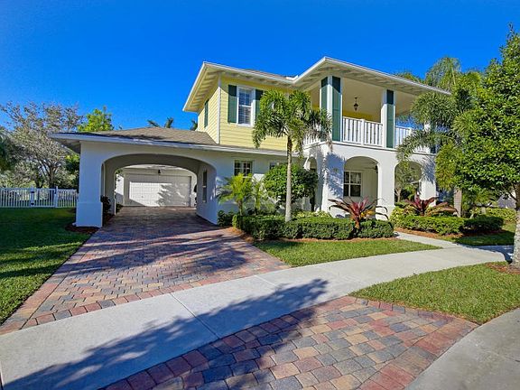 Magnificent luxury home set in coastal elegance on a premium lot within a cul-de-sac offering 5 beautiful bedrooms, den and 4 full baths with tons of upgrades and enrichment such as rich wood flooring, plantation shutters, crown molding and designer wall coloration with luxurious appeal. Intelligent architecture on a 1/3 of an acre lot allows for deep front patio with equally inviting above covered balcony, screened lanai, covered car port and 2 car garage. Step inside for formal living room trimmed in custom window treatments and crown moldings, spacious family room with wall of sliding glass doors for captivating tranquil lagoon views and private custom dressed dining room for remodeled kitchen's culinary delights. Benefit from granite counters, stainless steel appliances, light washed-wood cabinets and breakfast nook basking in tropical pool views. Retire to generous upstairs master suite offering enormous California-styled walk-in closet, custom wall and window dressings and roomy bath plus a grand view of the surrounding Martinque enclave of the Abacoa community on private deep covered balcony. Laze on gorgeous back patio with free-form and heated salt system pool featuring raised rock encrusted hot tub for exotic water feature. Ideally surrounded in mature Royal and Coconut palms within large and fully fenced back yard. This impressive home is only surpassed by it's outdoor resort-like accommodations. Some furniture negotiable. Well over $200,000 invested in upgrades and location for picture perfect presentation. HOA Capital contribution required from buyers at closing