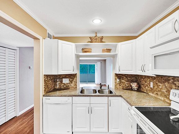 Location, Location Location! This updated, totally renovated condo is in desirable Lake Meryl. It's close to the west gate, and has a premium water view over looking a wooded area- a perfect sanctuary for birds! Check out the wood laminate flooring and crown moldings throughout. The custom kitchen has new cabinets, high end Formica counters & stone travertine back splash. The owner renovated this convertible 2nd BR model for personal use, sparing no expense with all new appliances, new A/C, recessed lighting with dimmer switches throughout. The kitchen light is motion sensored, & the unit has 2 full baths & 2 walk in closets. The porch has sliding glass windows for year around use & storage closet. The satellite pool is just steps from the condo. Check out pics for community amenities!