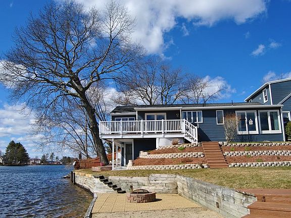 Panoramic Views Define this Unique Webster Lake Waterfront Contemporary! A rare find with 190' of water-frontage spanning the horizon from East To West! An over-sized Pavilion sits at water's edge providing a peaceful place to enjoy friends, family & nature along the great Cedar pond! There is a lakeside patio, fire pit & sandy beach area for swimming, huge waterside decks & aluminum docks to enhance boat access! Unique Contemporary style home offers 2,497 SF+/-, 9 Rooms, 4 Bedrooms, 2-1/2 Baths including private master bath. The main living features an open concept w/kitchen/dining/living & year-round sun-room, a lake facing private master BR suite, 2nd Bedroom on main level plus 2 more spacious Bedrooms on 2nd floor, for a total of 4! The walkout lower level features a family room, half bath & lakeside 3 season room for maximum lakeside enjoyment, a 2 car attached garage w/storage, handicap access ramps to main level and lakeside yard!