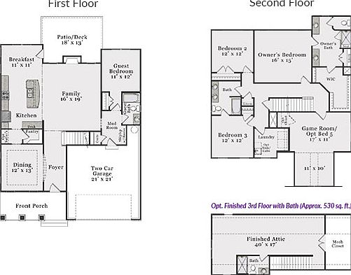 McKee Homes presents the Brooks 2020 Craftsman floorplan with open-concept living area, kitchen and formal dining room on the first level as well as a guest suite with full bath. The dining room can also function as a flex room and be used as an office, study, den, playroom or whatever suits your family's lifestyle. The second floor boasts a beautifully appointed owner's suite with a large walk-in closet and private bath with dual sinks and large shower with seat. This lovely home also features two additional bedrooms upstairs along with a huge game room and large laundry room. The Brooks 2020 Craftsman elevation features a blend of stone, siding and specially styled roof lines and supports that add a distinctive elegantly refined style to each home. First-floor options include a sunroom with plenty of light and deluxe kitchen layout. Second-floor options include a deluxe owner's bath and game room closet which allows it to serve as a fifth bedroom. In addition, the third floor can be finished to include a full bath. Sideload and three-car garage options are also available depending on lot size and orientation.