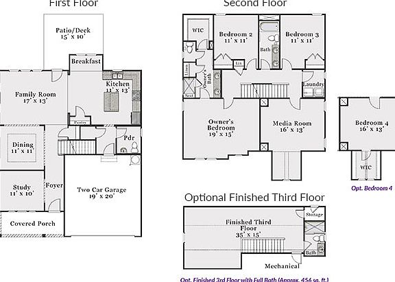 McKee Homes presents the Nelson 2020 Coastal floorplan. As you step into the foyer, you're met with a traditional study - a space that can easily transform into a home office or kid's playroom. The entryway quickly unfolds into an expansive main living area that connects a wide-open dining room, family room, and contemporary kitchen with island and eating nook, as well as access to the beautiful outdoor patio. The second floor features an expansive owner's bedroom with huge walk-in closet. The owner's bath includes a linen closet, dual-sink vanity, and shower with seat. There are two additional bedrooms, full bath, laundry room, and a huge media room to finish out the second floor. The Nelson 2020 Coastal elevation features custom exterior details that make it perfect for the coastal and beach-front lifestyle. The absence of stone and brick on the front with special details and trim give these homes a true coastal look. Options include a deluxe bath in the owner's suite, a walk-in closet in the media room allowing it to be used as a fourth bedroom. For even more space, add a finished third floor with full bath. Additional exterior options include a covered rear porch and sideload or three-car garage depending on lot size and orientation.
