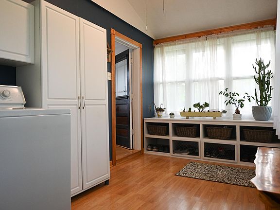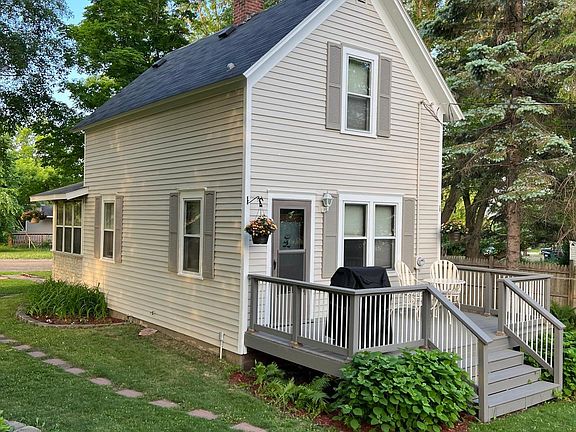 Darling home on beautiful treed lot with many perennials, large deck, main floor laundry, enclosed front porch, 2 car garage ,heated and A/C . Home age is 1920 and brought into this location and a new basement in 1980 so many updates and the garage are from that age. Corner lot , storage room in basement.