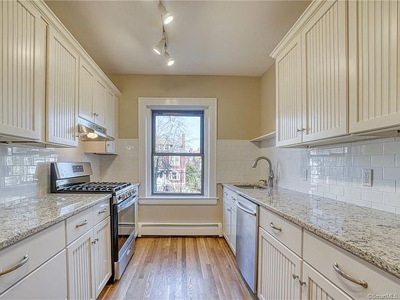 A classic corner unit, ranch style condo with views of East Rock. Freshly painted, refinished hardwood floors throughout. Beautifully updated kitchen with stainless appliances, granite counters and tile backsplash. Lots of counter space, cabinets including a pantry with pull-outs for storage. Large entry foyer with front hall closet. Living room includes a fireplace and built-in bookcases and opens to the dining room. Two large bedrooms with views. Brand new Pax wardrobe and children wardrobe to stay. Updated bathroom with new vanity and bathtub. New in-unit washer and dryer. New window AC units included for the two bedrooms. Lovely complex with central courtyard and easy access to Yale, hospitals and all East Rock has to offer. Walk to Yale shuttle stop on Whitney Ave. One small cat possible. Rent negotiable with good credits. Start date negotiable, May 1st also possible. Renter pays all utilities-gas, electricity, internet, etc. Parking is on street. Lease is at least one year.