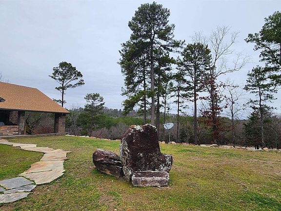 Custom built home sitting on 12.61 acres with an amazing mountain view. Less than a mile to Lake Ouachita. Built in 2015. 2540 sq, 2 bed 2 bath with an office. Attached 2 car carport with concrete. Bathroom floors are heated. Shower in primary suite is a 5' tiled walk-in shower. Primary bath has 2 separate vanities. Home has 3 water heaters to keep everyone supplied with hot water. Vaulted ceilings, granite counter tops, hickory cabinets throughout. Cypress walls in living area. Pella windows in every room. 36" interior doors. Mostly furnished. Stainless Steel KitchenAid appliances. Rock fireplaces (gas logs) in living area and sunroom. Large Sunroom has an amazing view, heated floors and vaulted ceiling. Lots of out door space with wrap around wooden deck (one part is 70x10 and other part is 40x10). Outdoor kitchen has a built-in Big Green Egg, gas grill, sink with cold/hot water. Storm shelter under home. Guest house is fully furnished (672 sq ft) has 2 bedrooms and 1 bath with kitchen. 19x15 "tool shed" with 12 ft porch, 40x16 "boat shed", 32x21 "man cave", 42x20 "barn", well, septic, 24kw Generac generator, 3 acre pine thicket, and stocked pond. The rock work is phenomenal.