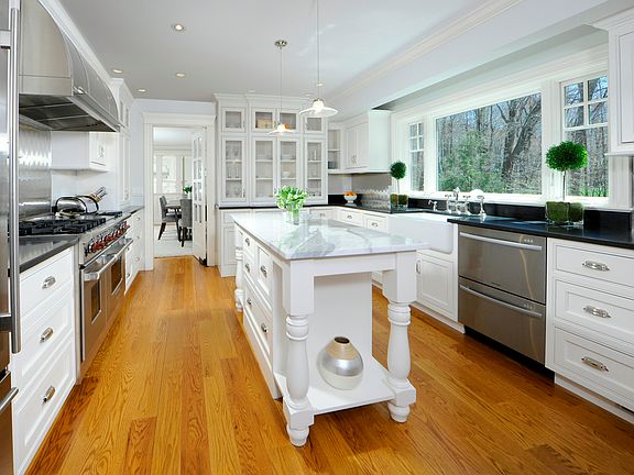 Stone walls frame the gated entry to this elegant mid-country colonial completely renovated with style and sophistication for 21st century living. Embracing two private acres at end of cul-de-sac with Burning Tree golf course views, the sun-filled, custom detailed home with open layout, chic modern lighting and fixtures has splendid indoor/outdoor flow with multiple French doors to columned verandah or expansive rear terrace. Fireplaces, 3-exposure views in gracious living room, coffered-ceiling family room. Formal dining room; study; stunning professionally equipped marble/granite center-isle custom kitchen; recreation/media room. 5 bedrooms, 4 baths; vaulted master wing with his/her walk-in closets. marble bath with BainUltra tub, shower, Perrin & Rowe fixtures. Generator; 2-car garage.