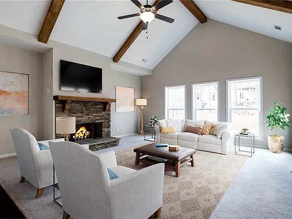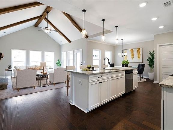 - Kitchen Features: Breakfast Bar, Eat-in Kitchen, View to Family Room, Stone Counters, Kitchen Island, Pantry Walk-In, Cabinets White