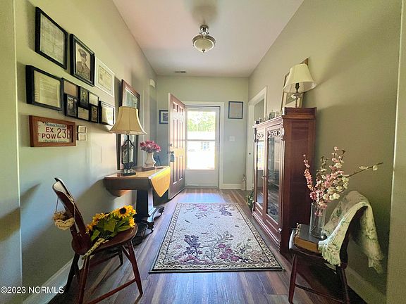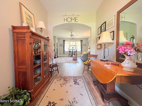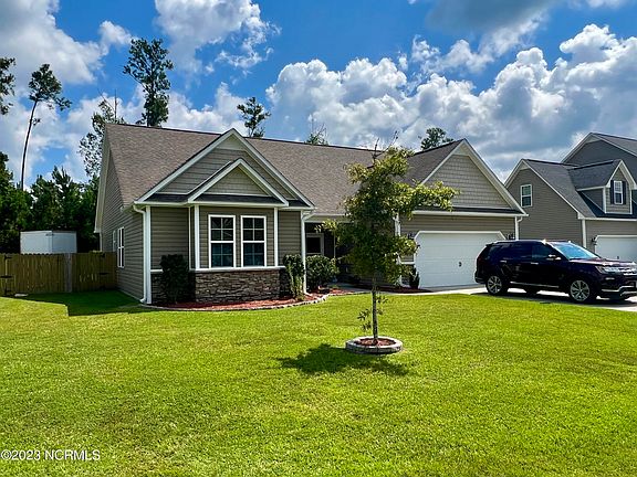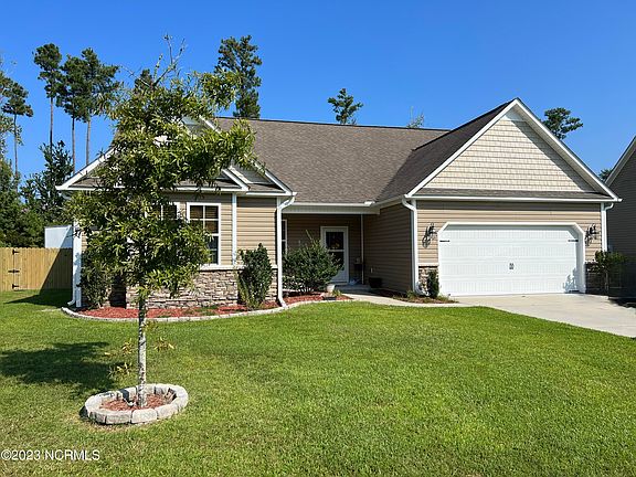 Welcome to 110 McCabe Court, a charming residence nestled in the tranquil subdivision of King Creek at Cherry Branch in Havelock, North Carolina. This delightful home offers a comfortable and spacious living experience, boasting a generous 1866 square feet of well-designed living space. As you approach this lovely property, you'll immediately notice its attractive curb appeal, featuring stone accents complemented by vinyl siding. The front yard greets you with a manicured lawn, setting the stage for the beauty within. Step inside, and you'll be greeted by an inviting open-concept layout. The living room seamlessly connects to the kitchen and dining areas, creating an ideal space for both relaxation and entertainment. This flowing design allows for easy interaction with family and friends, making it the heart of the home. The kitchen is a true highlight, offering practicality and style. You'll find a double-door pantry for ample storage, a stylish stone backsplash that adds a touch of elegance, and new appliances, including a refrigerator and gas stove. Preparing meals here will be a joy, and the adjacent dining area makes serving and enjoying them a breeze. This home features three comfortable bedrooms, providing plenty of space for your family or guests. The owners' suite is a haven of relaxation, complete with a spacious walk-in closet and an ensuite bathroom. The ensuite boasts a dual vanity, beautiful tile flooring, a walk-in shower, and a luxurious soaking tub - the perfect retreat after a long day. Additional features of this property include a fenced-in backyard with a wood fence, ensuring privacy and a safe space for outdoor activities. A two-car garage provides ample parking and storage space, while new washer and dryer units add convenience to your daily routine. The interior has been freshly painted, creating a bright and welcoming atmosphere throughout. Notably, this property is not located in a flood zone. Call today before it's gone.