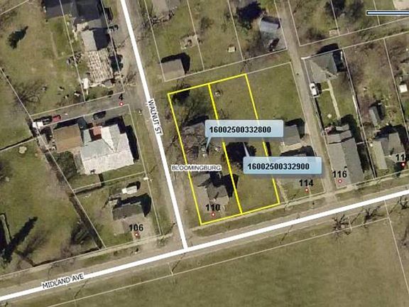 LIVE ON AUCTION Saturday November 23, 2019 Real Estate sells 11:00 a.m. 110 Midland Ave, Bloomingburg, Ohio. Two parcels fronting 100 feet on Midland Ave and 160 feet in depth along Walnut Street. Parcel could be split into 2 sites, one with residence and one building site. Residence is 2 story with 1427 sq ft living area on crawl space, 8 rooms with full bath. Heated by gas forced air furnace, updated electric service and modern forced air furnace. Garage built 1981 22x24, needs new roof. Home needs updating and repair but still a solid home worth your consideration. Taxes on residence $690.16 per year- vacant lot $134.92 per year. Zoned Residential in village. Served by village water and sewer. Terms on Tract 2: $1000 down day of sale and balance on or before December 23, 2019. Appraised at $15,000 and sells with confirmation of executor date of sale. Executor is motivated. House and lot sell as one unit. Possession on passing of deed. AUCTION HELD AT 3427 US 62 N, Washington C.H., OH, 43160
