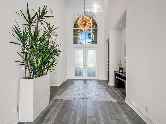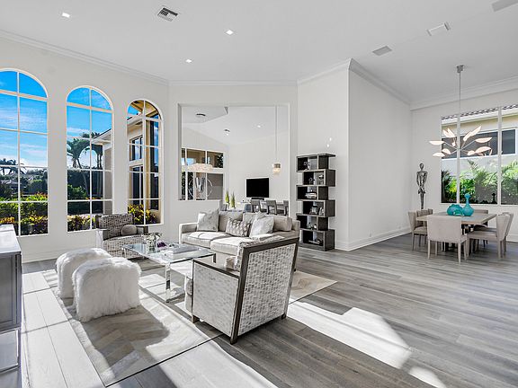 This magnificent home is offered in Mirasol Country Club with Full Golf Membership and is currently the only home with a golf membership, but that is just the beginning of the story for this newly designed one of a kind tropical paradise. Completely redesigned from wall to wall, and floor to ceiling less than 2 years ago by renowned Interior Designer Annie Santulli, it is pure grace and soft contemporary design from start to finish.Perfectly appointed with elegant designer custom lighting and chandeliers, custom wide plank French oak hardwood floors, beautiful white quartz counters and backsplash, white custom kitchen cabinets, Viking kitchen appliances, and a new master bath with walk in shower and free standing tub.