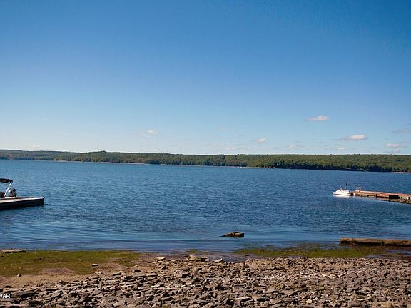 Lake Wallenpaupack Lakefront w/140' Frontage & flat terrain in Colony Cove North. This two-deeded 2-house package includes a 4 bedroom, 3.5 bath main house made of solid construction, floor to ceiling stone fireplace, 2 master bedrooms w/en-suite bathrooms, 4-season room, wide plank floors, central A/C & garage. 2nd residence, located above a 4-car garage, features vaulted T&G ceilings, an open floor plan, large master bedroom, full bath, LR & kitchen. Amazing sunsets from this property!