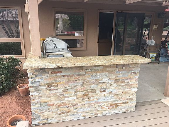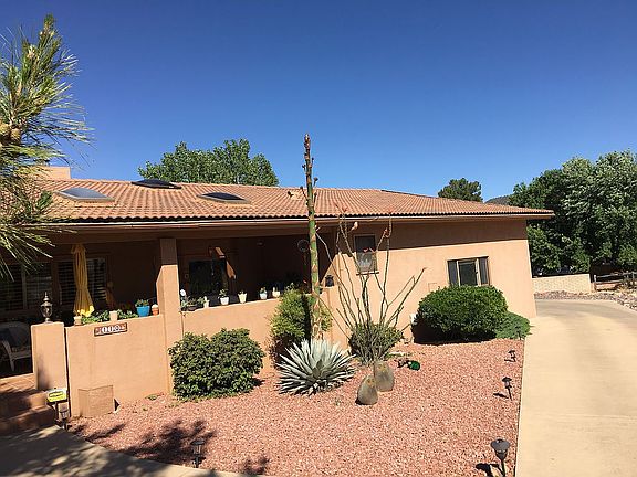 This lovely 3 bedroom home has an attached RV port, plus a 3 car garage. located at top of a cul-de-sac. Views of Oak Creek Golf course from patios. Remodeled in 2017. Updated kitchen with gas cook top, tile and hardwood floors throughout, shutters, security. Inviting front porch. Social kitchen, walk-in pantry, Under counter and indirect above cabinet lighting, pull-out shelves, wine fridge. Designed for easy access to all rooms & entry to the outdoor living patios. Master bedroom large walk-in closet, five piece on-suite, with jet tub, and shower. Guest bedroom, guest bath and office/bedroom entered from a spacious multi-use foyer. Skylights throughout. Easy to use loft storage. Utility room w/bath. Two AC systems. 2019 Outdoor kitchen and bar installed. Septic permit for 3 bedrooms. Solar added in 2020. Landscape water feature added in July 2023.