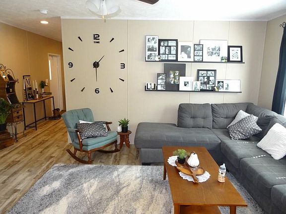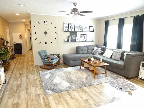Rare find! 3 bedroom, 2 bath mobile home only 8 months old on 2.81 acres. Huge open floor plan for living, dining, and kitchen area. Kitchen has stainless farmer's sink, contemporary stove hood vent, and the refrigerator remains with other kitchen appliances. Additional buffet counter or coffee station. Abundance of can lights in kitchen and living areas. Both guest bedrooms have private access to the hall bath. Master bath has separate soaking tub and shower, two separate vanities, and separate his and hers closets. Upgraded XL water heater.