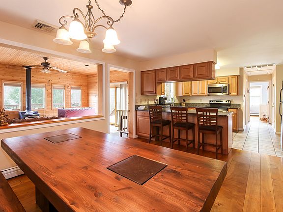 With sweeping views & southern exposure, this renovated ranch-style home boasts abundant sunlight, a flexible, smart floorplan & many upgrades not often found in this price range. Enjoy an open concept, kitchen to dining area w/ granite tops, breakfast bar & s/s appliances. Step down to your warm & relaxing den perfect for entertaining, complete w/ wood stove, surrounded by windows & doors leading to a wrap-around deck. Your living room's focal point is an oversized window overlooking beautiful landscape in all seasons. Rounding out the main level is a master suite w/ full bath, 2 addt'l bedrooms w/ full bath. Lower level bonus room & full bath offers 300sqft of versatile space. Deceptively spacious.