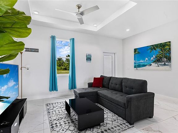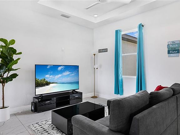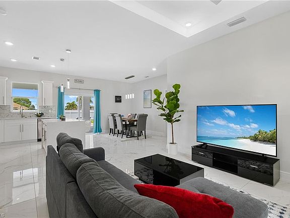 Welcome to your dream home in SW Cape Coral! This stunning 3 bed, 2 bath features a new heated pool, fenced yard, and western-exposed lanai.This property is on city water and located just minutes away from the Pine Island Corridor, where you can find an abundance of restaurants and shops. The circular concrete driveway adds a touch of elegance to the property, while the custom kitchen boasts 36" white shaker cabinets, stainless steel appliances, crystal white quartz, and a beautiful waterfall kitchen island top. The marble 32x32 tile throughout, LED lighting, and impact-resistant windows and doors provide both style and safety. The master bedroom features his and hers walk-in closets, while the master bathroom boasts his and hers sinks and a walk-in frameless glass shower with polished stone flooring. Both bathrooms have been upgraded with stunning finishes. Furniture, washer, and dryer are negotiable. With all these upgrades, prime location, and unbeatable price point, this home is truly one of the best deals available in the market. Don't miss out on the opportunity to make this house your dream home! Please note that the fence is brand new, and the painter will be finishing their work this week. Additionally, the roofer is expected to complete their work by the first week of June.