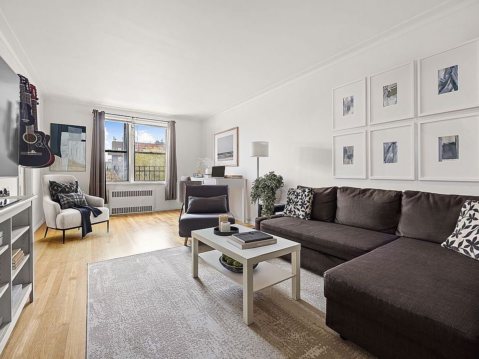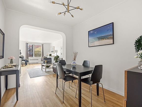 Lovely, turnkey two bedroom co-op apartment with pre-war style in post-war building located on the Kensington/Windsor Terrace border. This beauty will check all the boxes on your list. A proper entry foyer with large coat closet greets you as you walk into the huge 20′ × 11′ living room plus a separate dining room. You will dwell well here. The windowed eat-in kitchen is updated, and is complete with quartz counters, plentiful cabinetry and has every convenience. The primary bedroom is oversized with two closets and the 2nd bedroom is large enough to fit a Queen bed with room to spare for desks and dressers. The retro bathroom has a new vanity and plenty of storage. Oak hardwood floors, cove ceilings, and a lovely archway separating the living and dining room are additional benefits.