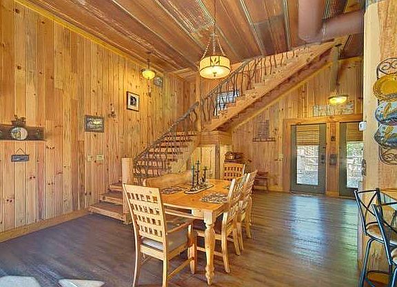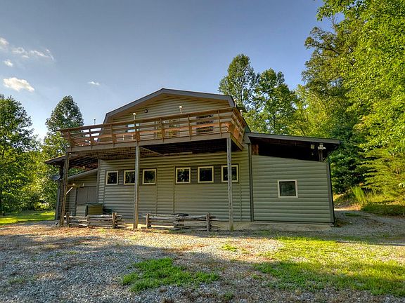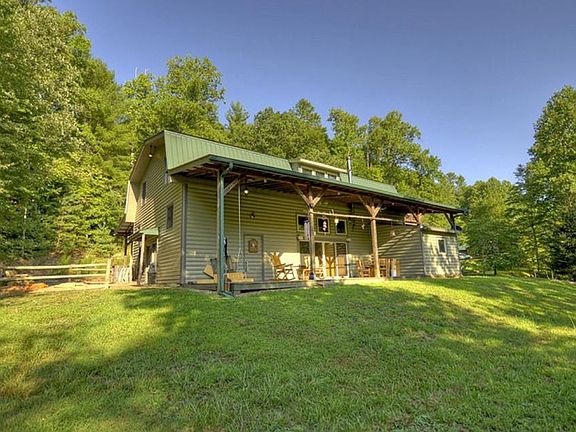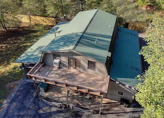 RUSTIC and UNIQUE Barn-Style CABIN with 116 Ft of Creek Frontage on WEEKS-CREEK!! This 3 Bedroom, 2 Bath and 2 half bath cabin features a high volume tin ceiling on the main level that adds to the unique sense of a mountain home, the spacious Kitchen has Solid Surface counters and SS appliances with lots of cabinet space! The kitchen opens to a large living room area with a gas-log fireplace and a wood burning stove that is sure to keep you warm and cozy. Large Master Bedroom with an on-suite bathroom. This floor-plan makes it perfect for one level living! The upstairs has beautiful T&G ceiling and floor with 2 additional bedrooms and a full kitchen! For outdoor enjoyment there are 2 porches, one screened, one 'rocking Chair', and an elevated 12 x 30 deck on the southern side. 'Fire Pit' with benches, and a sitting area next to Weeks Creek.This cabin is located within 30 minutes from Blue Ridge, and Blairsville.