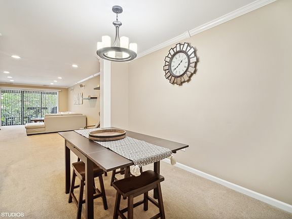 Gorgeous setting for this large two bedroom & two bath condo with private balcony nestled among the trees, ready for you to move in and enjoy the apartment. Quiet and serene day and night. Original owner loved the size of the rooms, the eat in kitchen with huge windows, large walk in closet in the master bedroom, the den with wet bar, and laundry room with additional storage. Kitchen has new flooring, equipped with all appliances and plenty of upper and lower cabinets. Large prep space makes preparing meals a breeze. Living room and dining room are perfect for entertaining family and friends with additional room in the den. All rooms lead from one to another. Second bedroom has large closet and overlooks the front of the condo, all closets are a good size as well as the linen closet. Wall of sliders in living room allows light to pour in. Maintenance free living allows you to enjoy life and do what you want to do. No worries about snow removal. Walking distance to shopping, restaurants and parks. Minutes to Metra and health clubs.
