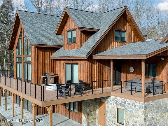Experience luxury mountain living in this brand-new custom-built 7-bedroom, 5.5-bath chalet with unobstructed views of Windham Mountain Club, set on 5 private acres just minutes from downtown Windham, NY. Designed with impeccable European craftsmanship, high-end technology, and sophisticated mountain style, this home is ideal as a primary residence, ski retreat, or luxury vacation rental. Sophisticated Interior Design- Step inside to discover an open-concept layout with soaring ceilings, panoramic windows, and a grand great room framed by the mountain landscape. The imported German kitchen and bar feature a hidden pantry, Porcelanosa counters and tile, a massive island, double dishwashers, and a professional Viking 8-burner range—a dream for chefs and entertainers. Throughout the home, every detail reflects artisan precision: handmade white oak floors and stair treads from Vermont, custom European doors from Poland (including a front door valued over 13K), and large-format Porcelanosa tile that creates a spa-like atmosphere. Four en-suite bedrooms, including a private guest suite, provide comfort and privacy. Two laundry rooms—one on each floor for added convenience. The floating glass staircase, open loft, and vaulted living spaces embody modern mountain luxury. Smart Home & Comfort Features- This home integrates advanced smart technology and everyday essentials for a seamless lifestyle: Sonos whole-home audio system, Ring cameras, & ADT security. MyQ Smart Garage controls smart thermostats & water control system. Radiant floor heating throughout and a whole-house generator for peace of mind. Two garages for vehicles, gear, and extra storage. Outdoor Living- Enjoy true mountain living on the Trex wraparound deck with a covered outdoor lounge, perfect for sunrise coffee, sunset dinners, or relaxing after a day on the slopes. The inviting front porch provides additional space to take in the crisp Catskill Mountain air and spectacular views year-round. Prime Catskills Location- Located in Windham, New York, one of the Catskills' most sought-after destinations, this property offers easy access to Windham Mountain Club for skiing, golf, hiking, mountain biking, and year-round recreation. The vibrant Windham village nearby offers boutique shopping, fine dining, and small-town charm- all just 2.5 hours from NYC. Investment Opportunity- Currently used as the owner's personal second home and a successful part-time luxury vacation rental, this property presents excellent income potential for buyers seeking a turn-key investment in the Catskills. Its combination of location, design, and amenities appeals to both high-end vacationers and full-time residents. Key Features Overview: 7 Bedrooms | 5.5 Baths | 5 Private Acres | No HOA -Direct Windham Mountain Club views -Imported German kitchen & Porcelanosa finishes -Handmade Vermont white oak floors & Polish doors- Four en-suites + two laundry rooms- Viking 8-burner range & double dishwashers- Radiant heating & whole-house generator- Full smart home system: Ring, Sonos, ADT, Garage, Thermostats, & Water control - Trex wraparound deck with covered lounge Two garages & ample storage space. This is a rare opportunity to own one of Windham's most striking new luxury homes, offering breathtaking views, modern elegance, and exceptional comfort year-round. Whether you're seeking a vacation home in the Catskills, a smart mountain estate, or an investment property near Windham Mountain, this home captures everything there is to love about upstate New York living at its finest. Windham, NY — The Catskills' premier destination for luxury ski homes and mountain retreats.