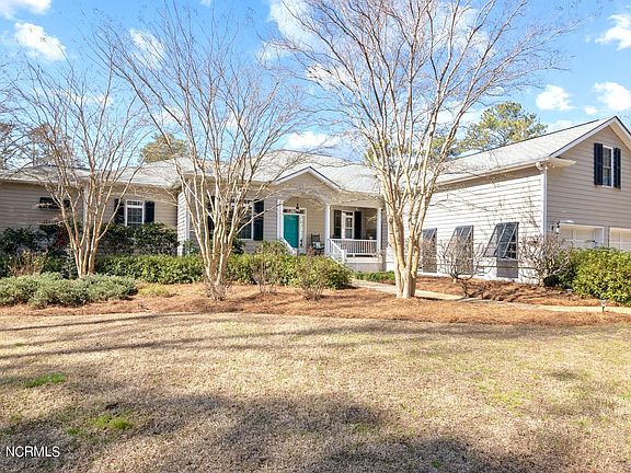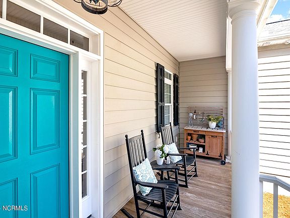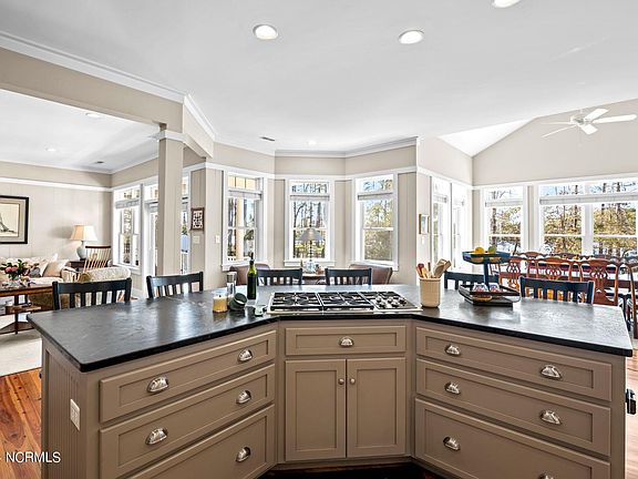 This southern inspired home is nestled among the trees on protected Orchard Creek. For the water enthusiasts, Orchard Creek flows into the Neuse River and beyond to the Intracoastal Waterways. From land, the home is centrally located 2 miles from the community of River Dunes and less than 10 miles from the town of Oriental, commonly referred to as the Sailing Capital of North Carolina. As you enter the front door, visitors and guests are welcomed by generous sized rooms with custom touches such as reclaimed heart pine flooring through out the public spaces, wood walls accents, oversized door ways, custom cabinetry, and an abundance of natural light afforded by the oversized windows and numerous transoms. Single level home with a first floor primary bedroom and guest rooms with en suite bathrooms. The primary bedroom enjoys views of the pool and beyond to Orchard Creek with a his and her walk in closet and sizable bathroom with air-jet bath, walk in shower, double vanities with mahogany countertops. The finished room over the garage (FROG) makes an adorable bunk room for children with play area but could be converted to an office, hobby room or art studio. The kitchen is any chef's dream with ample prep area on the soap stone countertops, stainless steel appliances, double ovens, soft close drawers. Cook while interacting with guests and family is made easy with the gas cooktop and down draft featured on the kitchen island that faces the eat-at counter and a cozy reading nook with waterviews beyond. This coastal home and its grounds were designed for entertaining friends and family with its backyard pool and fire pit area. The Trex dock has a 16' x 40' slip and boat lift. Concrete kayak launch with power & water hooked up with 4+ ft depth at dock. Generator, Kinetico water softener. 2 bay garage with workshop. The workshop is heated and cooled.