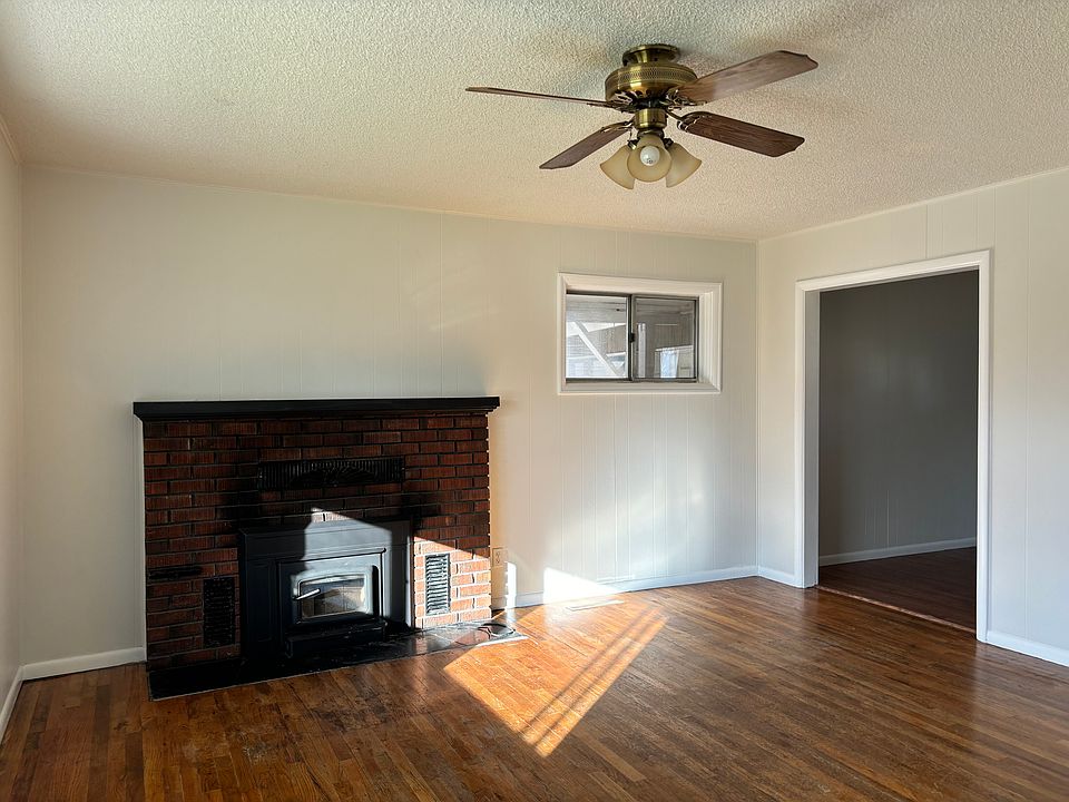 Newly interior painted home with new kitchen, dining room, and bathroom flooring. New bathtub, bathtub surround, toilet, sink, vanity, and range. Includes refrigerator/freezer, dishwasher, stacker washer/dryer, covered carport, covered front patio and back deck, automatic sprinkler system, hardwood floors, three storage sheds, and gas heat. Close to large park.
