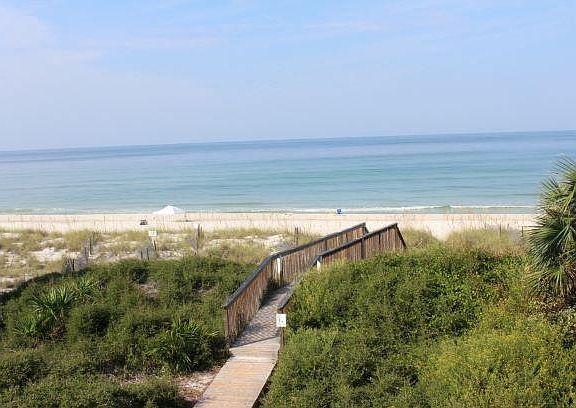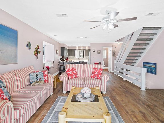 Charming 2 BR / 2.5 BA updated townhome in Barrier Dunes. Barrier Dunes is a gated community with stocked fishing ponds, playground, two swimming pools, tennis courts w/pickle ball), paved roads, streetlights, and 4 beach accesses. This home has been updated with hardwood floors, granite counter tops in kitchen including a deep sink. The living area is spacious with a bay window, the dining area seats six comfortably and there is seating for two at the bar. The second floor has two bedrooms each with its own private bath. The street side bathroom has a balcony and the other bedroom has an open deck. At the main level is an enclosed outdoor shower and a separate storage room. Enjoy the tranquility of being in the back side of the complex but yet your less than a 5-minute walk to the beach! A MUST SEE!