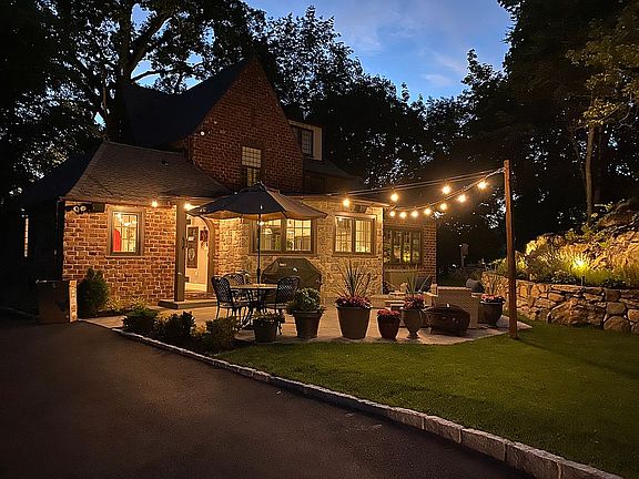 Cotswold Cottage designed by Lewis Bowman, c. 1920 (original plans on file at Cornell School of Architecture). The home was gutted and fully renovated in 2006; In Dec 2018 a 749-sqft addition was completed. Renovations include: * New 24x18 kitchen includes: quartz counters and 40-sq ft island; 48" 6-burner stainless Wolf range w/ griddle; stainless 1200cfm hood; Samsung stainless 4-door fridge w/ ice/water/sparkling water dispenser; two stainless-tub dishwashers (Bosch and KitchenAid); under-island Sharp drawer microwave; 40” farmhouse sink w/ Grohe faucet and 1-hp garbage disposal; stainless wine fridge; abundant storage (+30 large cabinets/drawers); designer marble backsplash; coffered bead-board ceiling with LED pendant lamps; large pantry w/ custom shelf system and technology rack for entertainment-system components; custom LED lighting; rounded wall corners; butler's pantry w/ custom glass cabinets and quartz countertop. * Formal dining room w/ large windows, exposed brick, LED lighting. * Mudroom w/ built-ins; arched exterior entry door; interior pocket door, slate floor. *Full-height basement w/ separate workshops, carpeted living area, utility room, lit/ventilated crawl-space storage, large toy closet, rounded corners. Shop floors and walls are epoxy coated. Slop sink, safe, fridge. Description: Four bedrooms including 3F suite, 3 full marble baths, 1FL powder room, dedicated office/Zoom Room with exposed brick, conservatory w/ arched ceiling, living room w/ exposed beams and wood burning fireplace, large family room w/ vaulted ceiling, large new gourmet/stainless steel/white kitchen with 40-sqft island. Details include: vintage oiled-brass and crystal door hardware; custom solid wood 2-panel doors; custom lead-mullion windows; original leaded glass windows; crown moldings; interior & exterior French doors w/ leaded windows; two open-hearth, wood burning fireplaces. Arched, solid mahogany entry doors (new 2015) with custom ironwork detail plus custom-built - solid mahogany storm door with ½” glass. Conservatory with barrel-vaulted ceiling. Living room with exposed-beam ceiling. Family room with vaulted exposed-beam. Office/Zoom Room has French-door to rear yard, separate heat zone, dedicated cable/internet feed. Other features: 2FL washer & dryer (new digital Whirlpool units 2016). Intrusion detection system; video monitoring. Internal sprinklers; smoke/CO2 alarms. On-line thermostats. Programmable irrigation. Backyard: professionally landscaped, irrigated yard w/ designer stone wall; granite outcroppings, low-voltage lighting, bluestone patio, exterior hot water; 20x20 freestanding 2-car garage. All house systems updated to code 2006, 2017 and 2020. Roof replaced 2007. Household systems: High-efficiency EK2000 gas boiler (overhauled Aug 2020) w/ new 40-gal water heater. 5 zones of heat and AC, 2 of 3 compressors are new (2019) and use updated R-410A coolant (i.e., no R22 Freon, banned in 2020), professionally serviced 4x per year. Electrical service = 300amps w/ exterior generator port + main-line shut-off for emergency power (i.e., generator can be plugged into an exterior port so interior circuits can run during power outage, mimicking normal service.) Basement French drain w/ 3 back-up pumps ported to sewer line or drywells. Downspouts & trench drains connect to 15,000-gal Cul-Tec drywells. Two old-growth oak trees recently pruned and pronounced healthy. Neighborhood Description 3-minute walk to downtown. 1-minute walk to train. Neighbors excellent. Lots of young kids. Topography and Orientation House has east-west orientation, w/ sunrise directly over backyard/kitchen and sunset in front. Large, old-growth trees provide significant shade. Village-owned empty lot to north will not be developed.