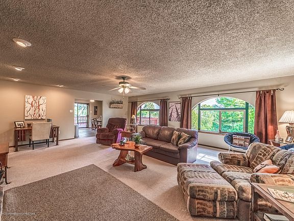 110 Plumas Pl is a cul-de-sac backing up to National Forest Land. 3 bedrooms / 2 full baths. Huge oversized garage. Upstairs to main living area, enter into home from garage into hallway between bedrooms or enter home through formal entry on left side of home into living room. Large open living room with large arched windows, wood burning fireplace. Dining nook and kitchen with laminate counter tops, cabinets with updated hardware, gas range. Sliding glass door to covered back deck overlooking tall Ponderosa Pines and valley views. Off kitchen down hallway to master bedroom with en-suite master bath. Down hall to large washer/dryer room, 2 guest bedrooms, and full guest bathroom. Outdoor water fountain feature, fenced dog run.