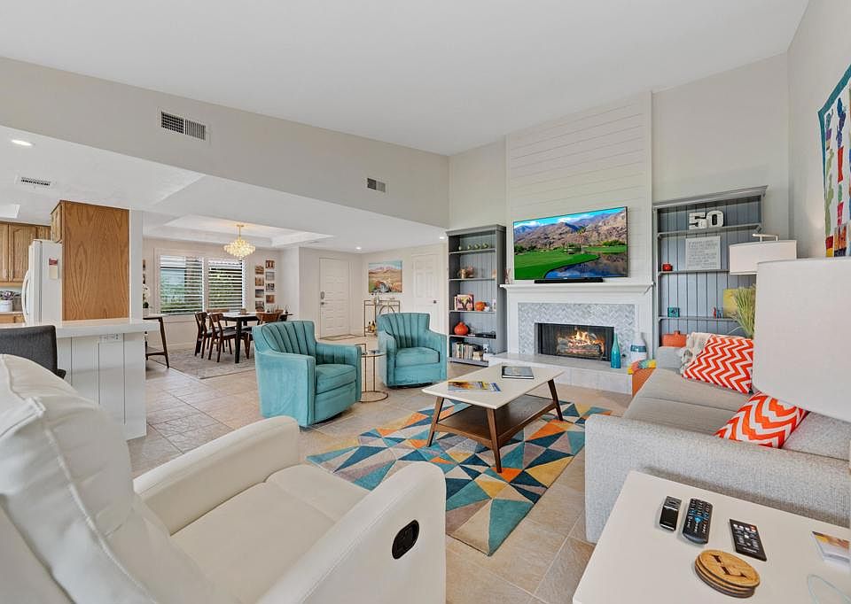 Modern elegance, sophistication, quality and luxury showcase this special home at the Chaparral Country Club. Upon entry up the private walk-way the entrance exudes warmth and style as you step into the classic living spaces with vaulted ceilings. The connection between the great room, stylish island and great outdoors with tranquil green fairways is seamless and lends itself to amazing desert living and entertaining. This home blends all the elements of design and space utilizing natural materials while employing a rich palate of soft colors and comfortable fabrics. Special upgrades include: dual pane windows and sliders, open kitchen concept, custom island with quartz counter tops, enclosed atrium with double fireplace, LED lighting and Nest thermostat. This spectacular home is ready for immediate occupancy.