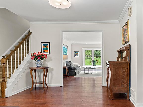 Welcome to 110 Quail Lane, a picture-perfect, updated and move-in ready detached home in sought-after Fox Chapel in Wayne. With a FIRST FLOOR PRIMARY SUITE and first floor laundry, this home offers the perfect blend of "right-sizing" with the privacy you want, in a walking-friendly, cul-de-sac neighborhood. Meticulously maintained with a newer roof (2018; Certainteed Landmark PRO) and newer natural gas HVAC (2016 and 2019). Energy efficient replacement windows were installed throughout (2018 and 2021, including the family room sliding patio door), and chimneys were re-lathed with new exterior finishing systems (in 2019). All bathrooms have been refreshed with new vanities (dove-tail, soft-close drawers) and new countertops, and the powder room underwent a tasteful top-to-bottom renovation in 2021. There is even an automatic switch-over Generac generator for peace-of-mind. Outside, a front garden-gate entry welcomes you and your guests. The large foyer opens to the living room, family room, and dining room with flow to the updated kitchen. These main floor living areas feature handsome, wide-plank and easy-care engineered hardwood flooring. From the foyer, you'll be drawn to the inviting living room with a wood-burning fireplace, recessed lighting and a large triple window overlooking the back yard with with mature landscaping. The welcoming family room features a gas fireplace, built-in bookshelves and a sliding door to the nested rear brick patio (with a garden gate to the back yard, privacy fencing on the side and a lovely private garden). The dining room is generously proportioned to accommodate holiday gatherings with family and friends. Flow into the bright kitchen with fresh white cabinetry, granite countertops, stainless appliances, a gas range, two wall ovens, a center island, two large pantry closets - and a sunny breakfast nook. Adjacent to the kitchen is the main floor laundry room (with inside access to the attached two-car garage), and very large, walk-in storage closet. The main floor primary bedroom suite comfortably accommodates a king-sized bed with end tables. There is plenty of space for a highboy or dresser, plus two closets - both with built-in organizing systems. The primary bath features a newer vanity and countertop and a separate "wet room" with an updated tiled shower and a soaking tub. The primary bath also features a third large closet for linens and more storage. Upstairs you'll find two generously proportioned bedrooms, both with large sunny windows and double closets. These bedrooms share a freshly updated hall bath with a newer vanity and countertops, new plank-style tile flooring and white subway tile surround in the tub/ shower combination. Also on this level is a convenient linen closet - and a wonderful surprise: An oversized storage room with two more walk-in closets (one with an organizing system), and utility closet (easy access to all systems). This super-fresh home is waiting for you!