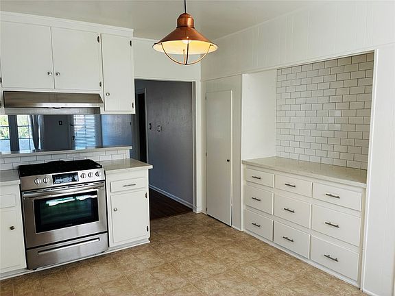 * Bright open kitchen with white quartz countertops & backsplash, white cabinetry with new chrome pulls, stainless steel appliances including as-is refrigerator, two compartment sink, built in storage & pantry closet, custom lights and breakfast bar. Back door to covered patio area.